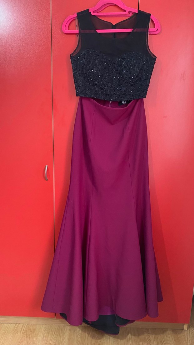 Uzun bordo renkte, straplez ve kolsuz tasarıma sahip abiye. Nakışlı ve drapeli üst kısmı ile fit kesim, iki parçadan oluşuyor. 1 defa giyildi Çok iyi durumda.