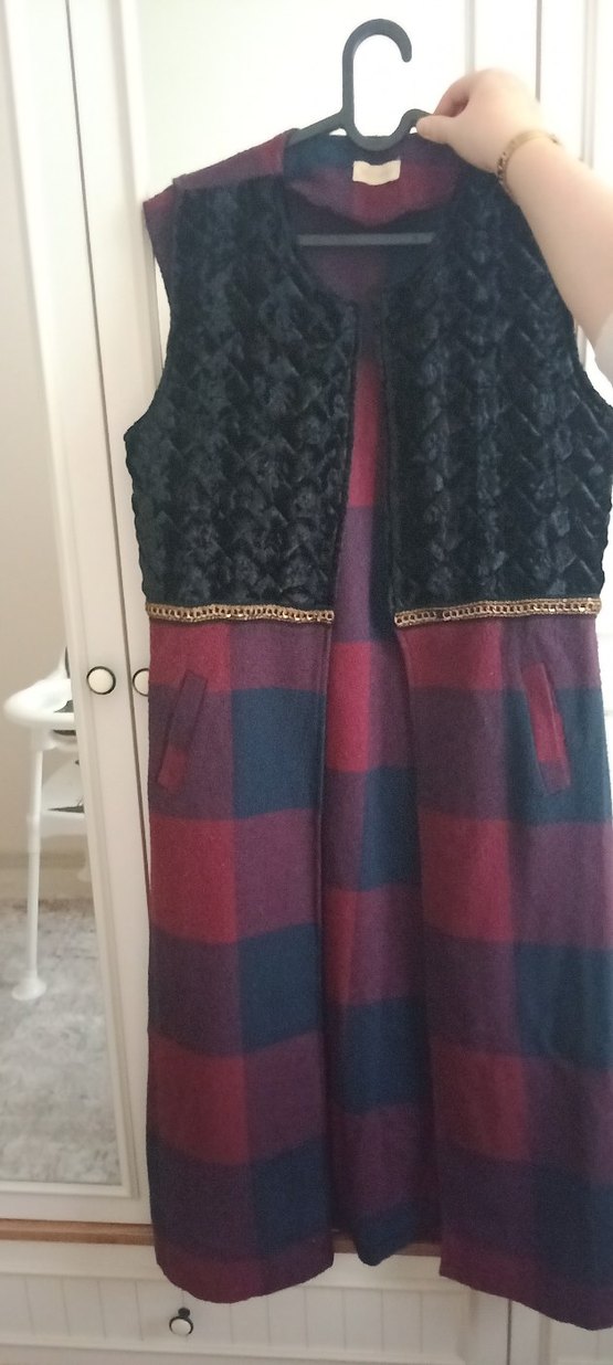 Uzun, bordo renkli kadın yelek, zincir detaylı ve kolsuzdur. Notched lapel yakaya sahip, bol kesim ve tekstil malzemeden yapılmıştır. sicak tutuyir kislik uzun yelek.