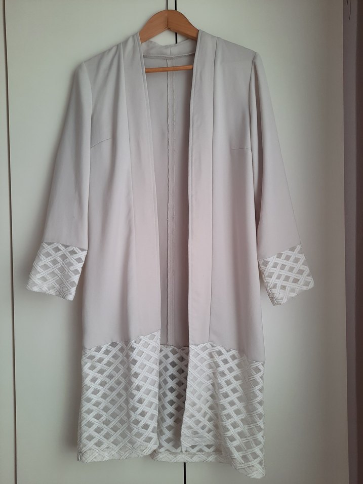 Uzun boy, beyaz renkte kadın kimono. Dantel detayları, uzun kollu ve regular kesim. Yumuşak sentetik kumaştan, sade ve minimal tarzda, günlük kullanım için uygun. Gömlek ve body üzerine kullanım için uygun