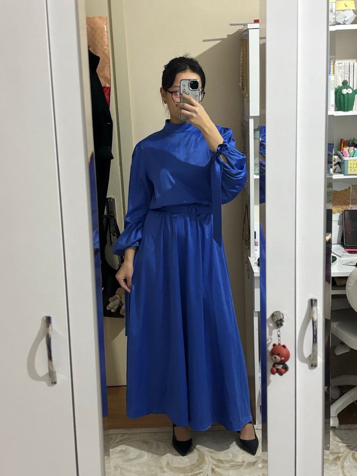 Uzun Boy Yüksek Yaka Mavi Saten Abiye Elbise