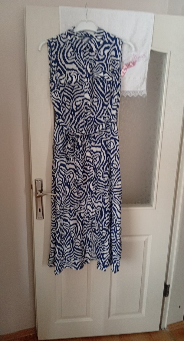 Uzun, vücuda oturan mavi ve gri zebra desenli, kolsuz, drapeli ve V yakalıdır. Bohem tarz için uygundur.