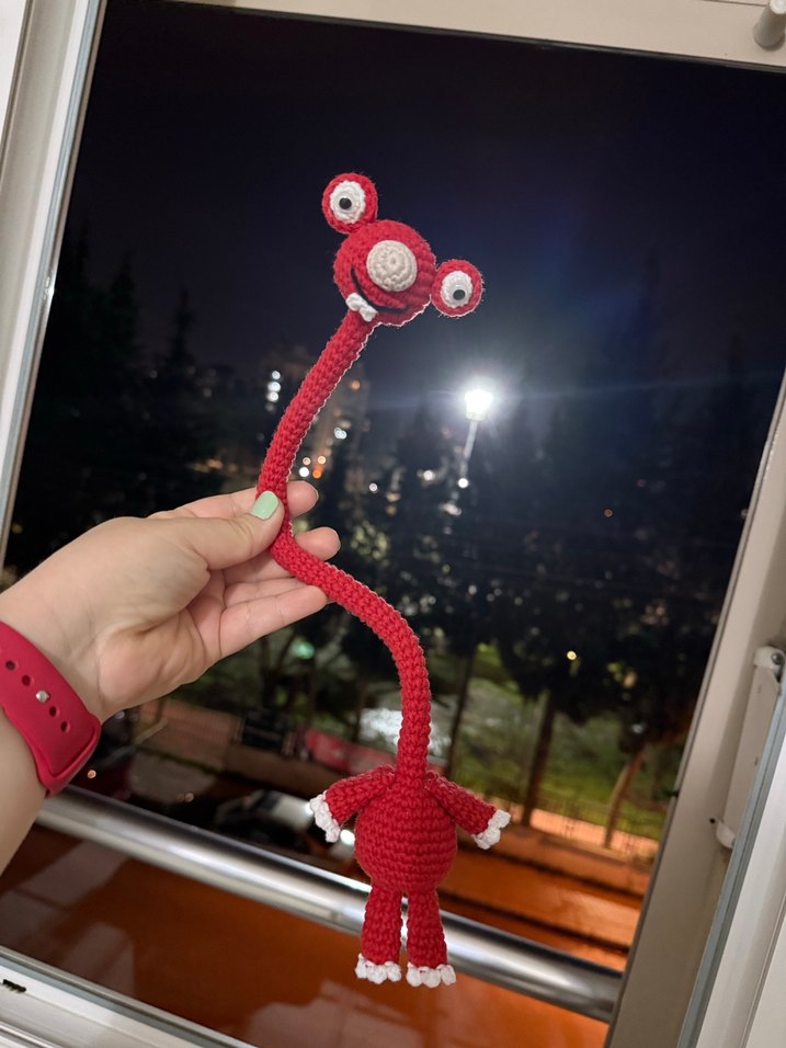 25 cm boyun uzunluğu , istenilen renkte tasarlanabilir. Uzun boyunlu, kırmızı renkli ve renkli gözlere sahip peluş oyuncak.