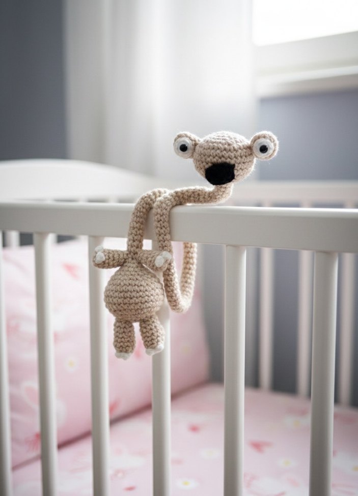 Yumuşak iplikten el örgüsü camel renk peluş oyuncak, büyük gözleri ve uzun boynu ile eğlenceli tasarıma sahip.