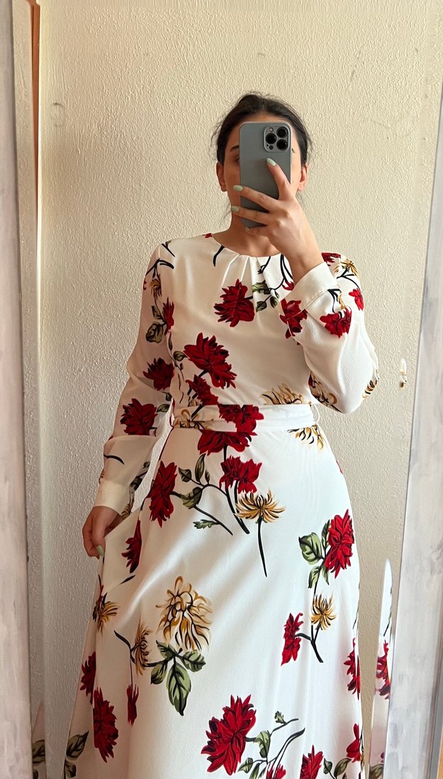 Yumuşak sentetik kumaştan, uzun kollu, yüksek yakalı, beyaz zemin üzerine canlı çiçek desenli, bol kesim bohem elbise. Drapeli tasarıma sahip.