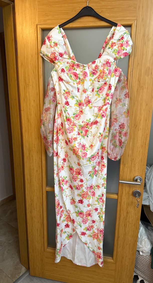 Uzun, kayık yakalı, çiçek desenli vintage tarzda, drapeli ve uzun şeffaf kollu bol kesim gelinlik