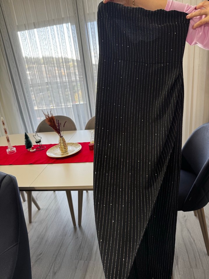 Sentetik kumaştan yapılmış, uzun siyah hamile eteği, ince çizgili ve drapeli tasarıma sahiptir. Ofis kullanımı için uygun, modaya uygun ve sokak stili etkisi taşır.