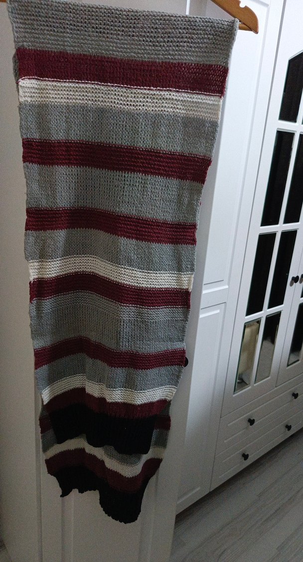 Gri ve bordo tonlarında çizgili, uzun ve rahat bayan atkısı, bohem tarz için uygun.