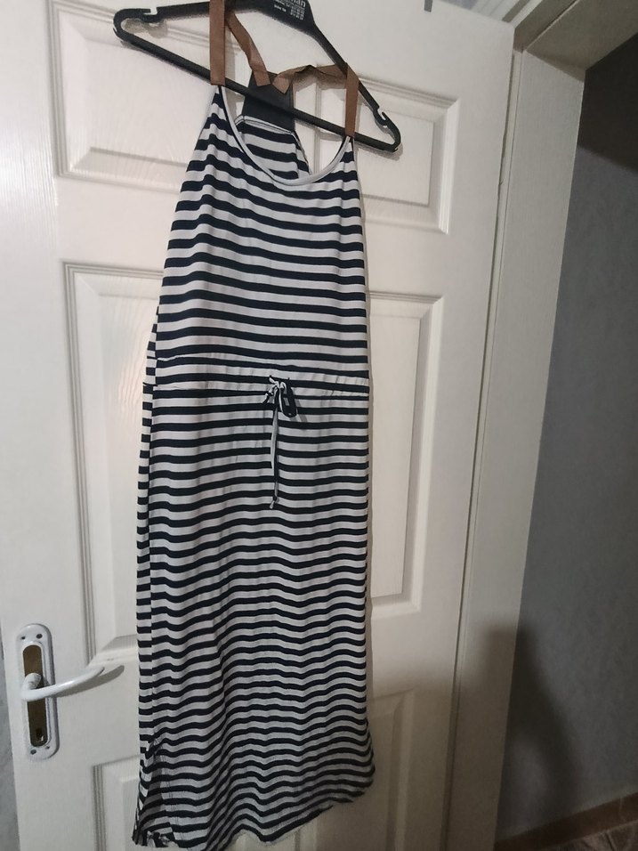Uzun, çizgili hamile elbisesi, ayarlanabilir kemer ve halter yaka ile tasarlanmıştır. Yumuşak sentetik kumaştan, bol kesim ve günlük sokak stili için uygundur.