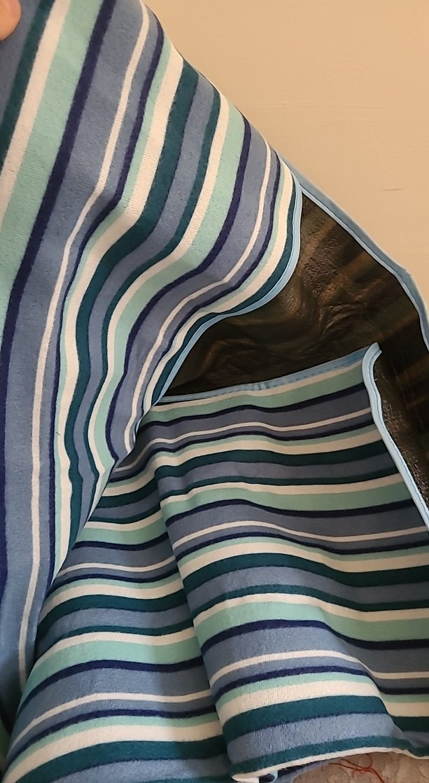 Uzun ve çizgili mavi-gri tonlarında, drapeli tasarıma sahip, rahat bohem tarzında içi naylon dışı polar piknik matı