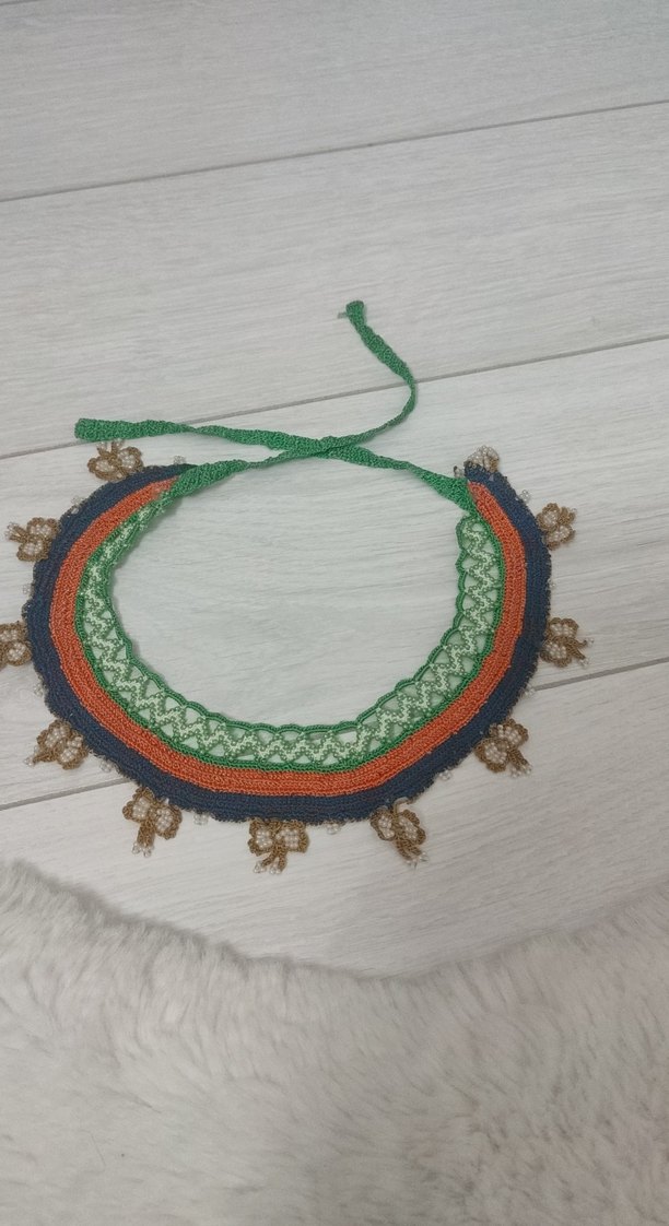 Uzun, çok renkli bohem kolye, nakışlı desenler ve boncuk işçiliği ile günlük kullanıma uygun retro tarzda.