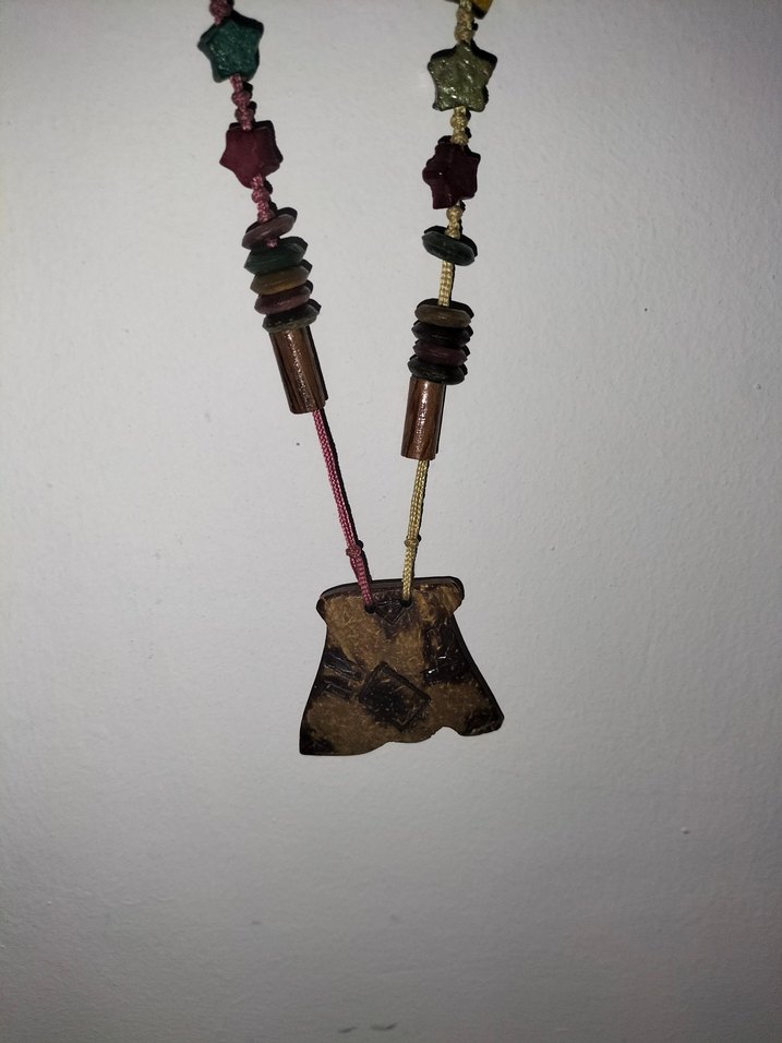 Uzun, çok renkli boncuklar ve desenli bir uçtan oluşan bohem tarzda kadın kolyesi.