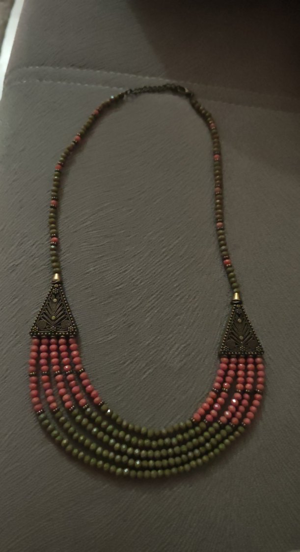 Uzun, çok renkli boncuklardan oluşan, bohem tarz metal detaylı kadın kolyesi.