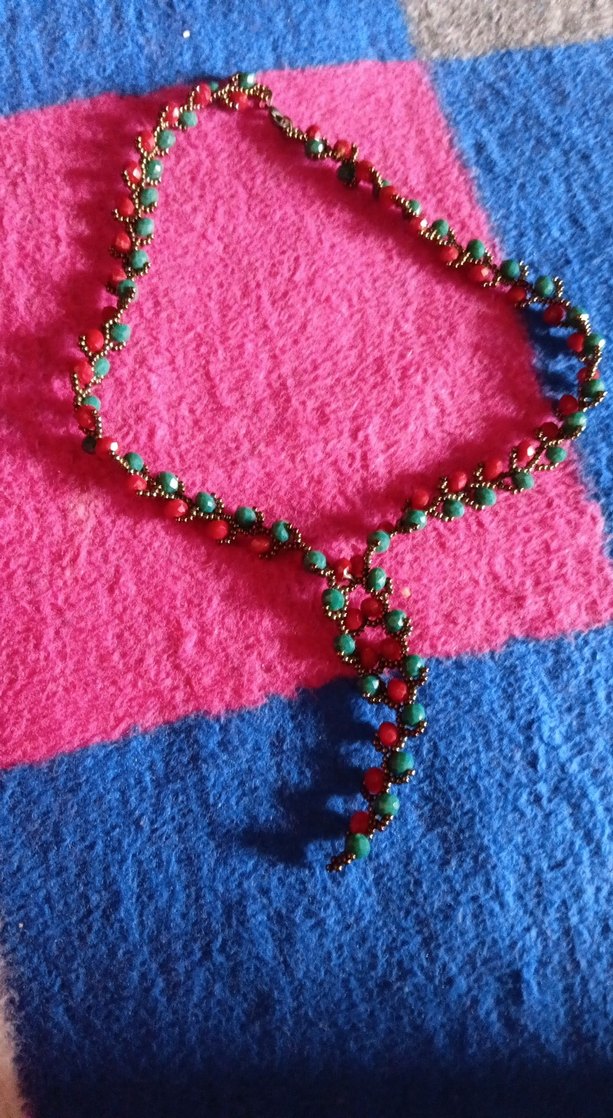Uzun, çok renkli boncuklar ve nakış detaylarıyla bohem tarzda parti için uygun kadın kolye. Yeşil ve kırmızı boncuklar sanatsal bir desen oluşturuyor.