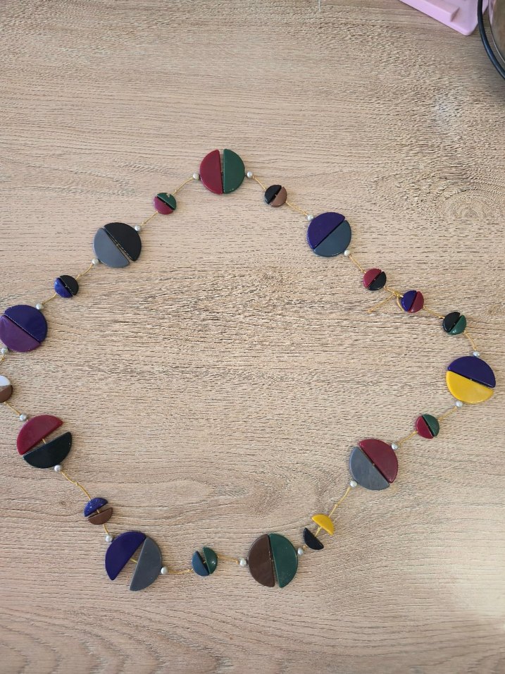 Uzun, çok renkli boncuklu dairesel parçalar içeren koyu renkli puantiyeli bohem kadın kolyesi, parti için uygun.