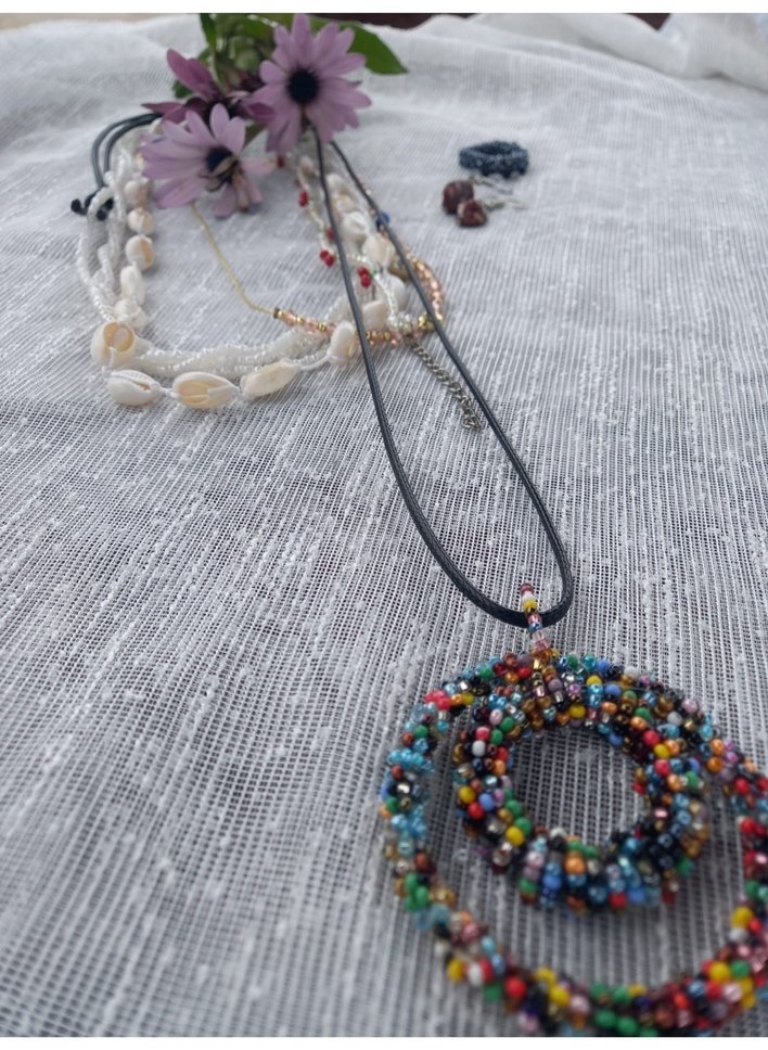 Uzun, çok renkli boncuklardan oluşan dairesel desenli bohem tarzda bir kolyedir. Günlük kullanıma uygundur ve kıyafetinize canlılık katar. #el emeği #takı#tasarım #tekli ürün
