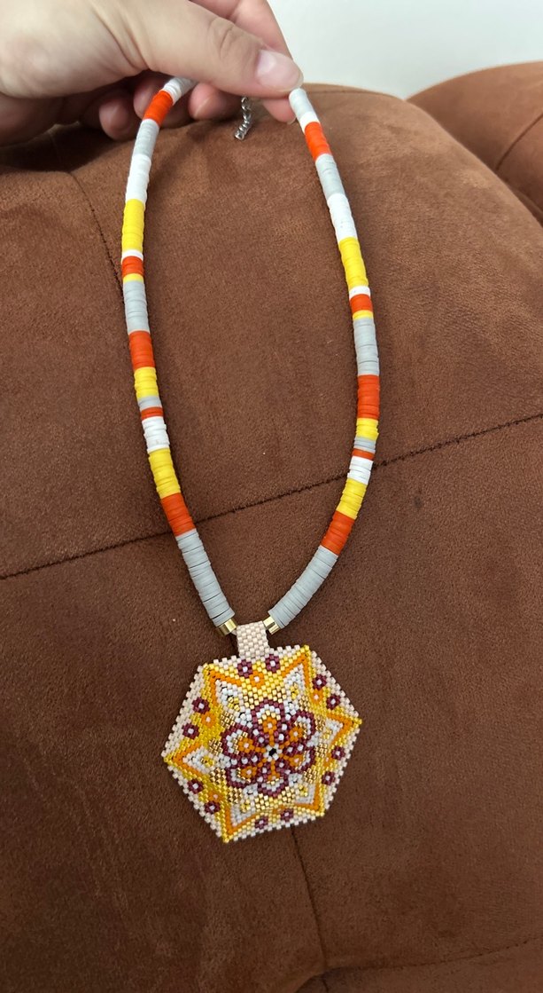 Uzun, çok renkli boncuklardan oluşan ve çiçek desenli altıgen bir kolye ucu bulunan bohem tarzda kolye. Günlük kullanıma uygundur. Miyuki örgü özel tasarım