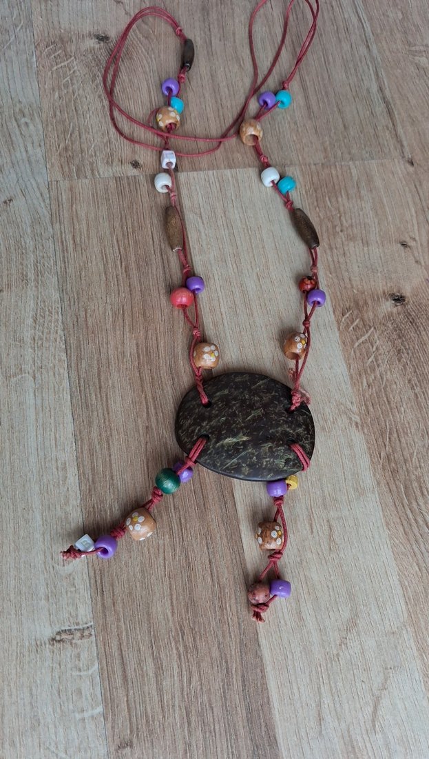 Uzun, çok renkli boncuklar ve koyu desenli bir merkez ahşaba sahip bohem kolye, günlük kullanıma uygundur.