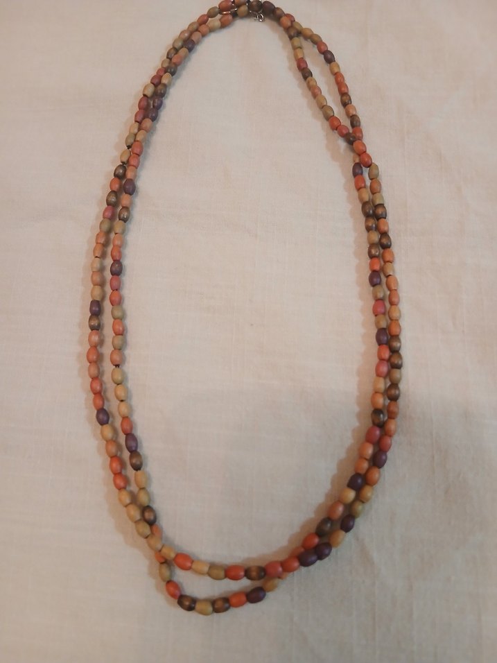 Uzun, çok renkli boncuklardan oluşan ve bağlama desenli bohem tarzda günlük kullanıma uygun kolye.