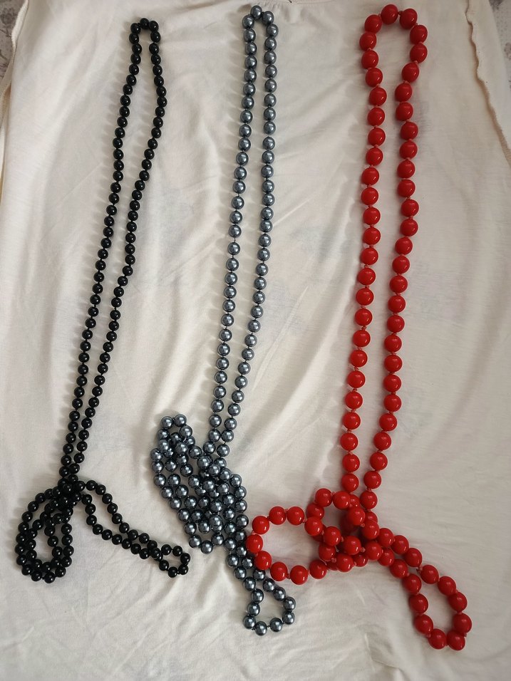 Siyah, gri ve kırmızı uzun boncuklu kolyeler, vintage tarzıyla parti için uygun. Boncuklar pürüzsüz ve yuvarlaktır. 1. ve 2. kolye 70 tl kırmızı renk kolye 200 tl