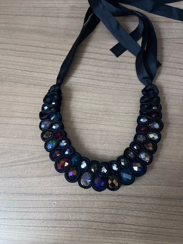 Uzun, koyu renkli çok renkli taşlar ve batik desenli, goth esintili gösterişli boncuklu kolye. Günlük kullanıma uygun.
