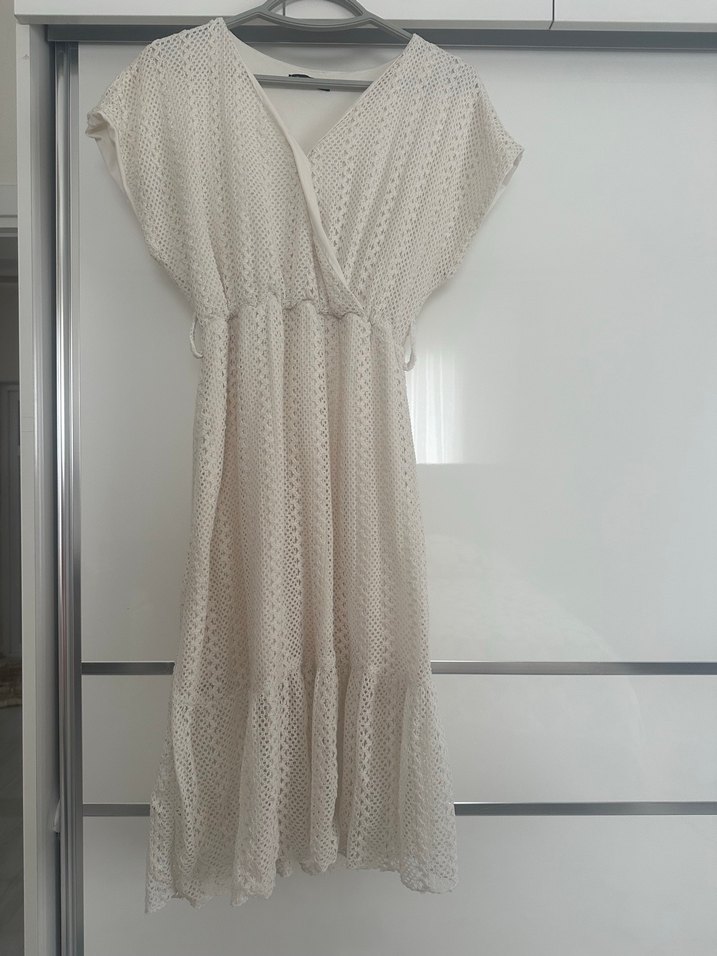 Uzun, kolsuz ve V yaka olan bu elbise, gevşek kesimi ve işlemeli dantel detaylarıyla bohem Paris tarzını yansıtıyor.