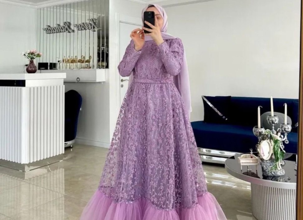 Bu uzun mor abiye elbise, işlemeli dantel detaylara, bol kesime ve tekne yakaya sahiptir. Uzun kollu ve pastel tondadır, düğün için uygundur.