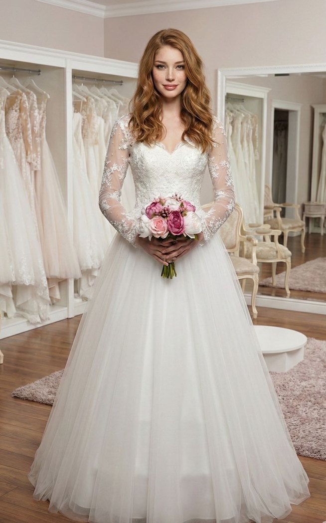 Uzun Dantel Kollu V Yaka Beyaz Prenses Gelinlik