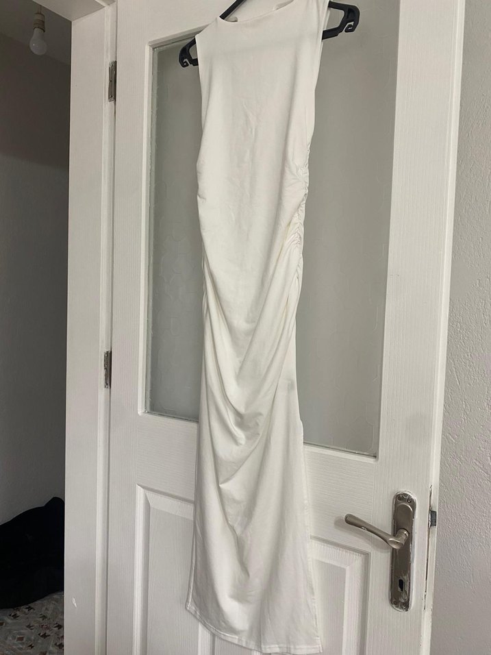 uzun dar kesim yırtmaçlı beyaz elbise astarlıdir 1 kez kullanilmistir