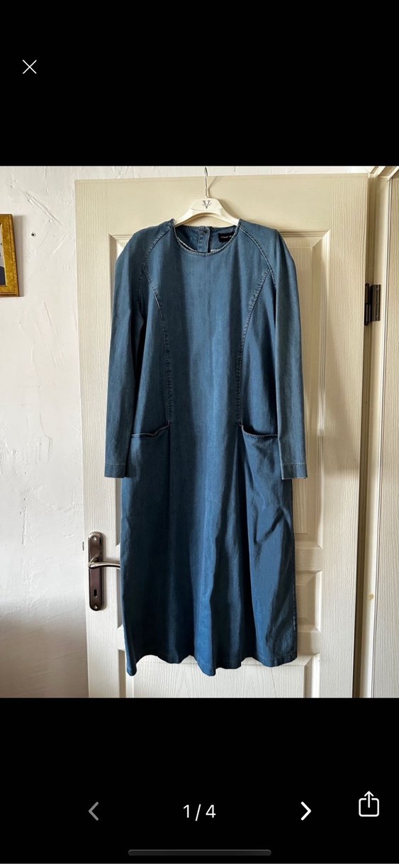 uzun denim elbise, uzun kollu ve yakasında kesikli detaylar bulunur. Düzenli kesim ve drapeli tasarımıyla günlük kullanıma uygun şık bir görünüme sahiptir.