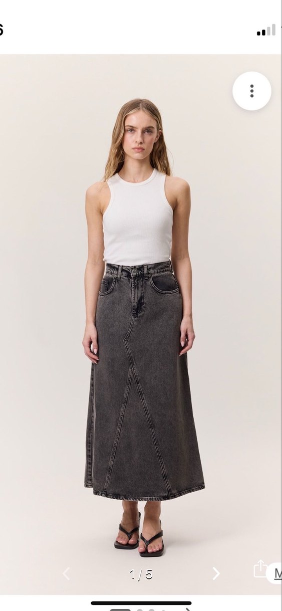 uzun, bol kesim denim etek, desensiz ve sade tasarımıyla günlük kullanıma uygun rahat bir normcore stil sunar.
