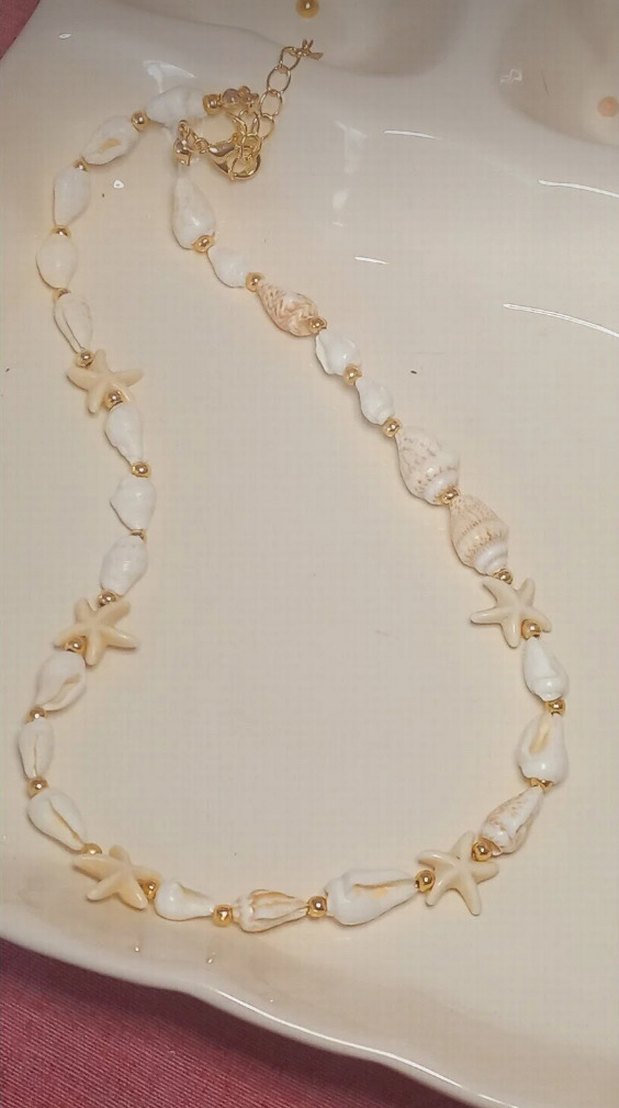 Uzun beyaz boncuklu bu kolye, küçük denizyıldızı ve deniz kabuğu şeklinde boncuklarla sade bohem tarz sunar, plaj için uygundur. SIFIR ÜRÜNDÜR