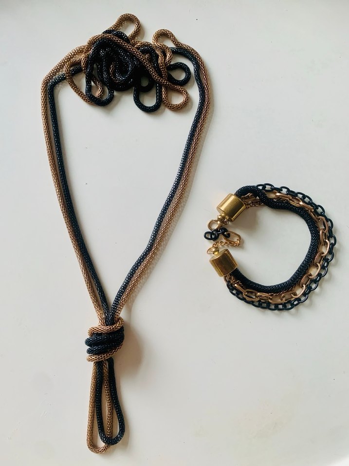 Kadınlar için uzun, desenli ve zincir detaylı bakır ve siyah tonlarında 2’li kolye. Bohem ve Paris tarzını yansıtan günlük kullanıma uygun set, bileklikle tamamlanır.