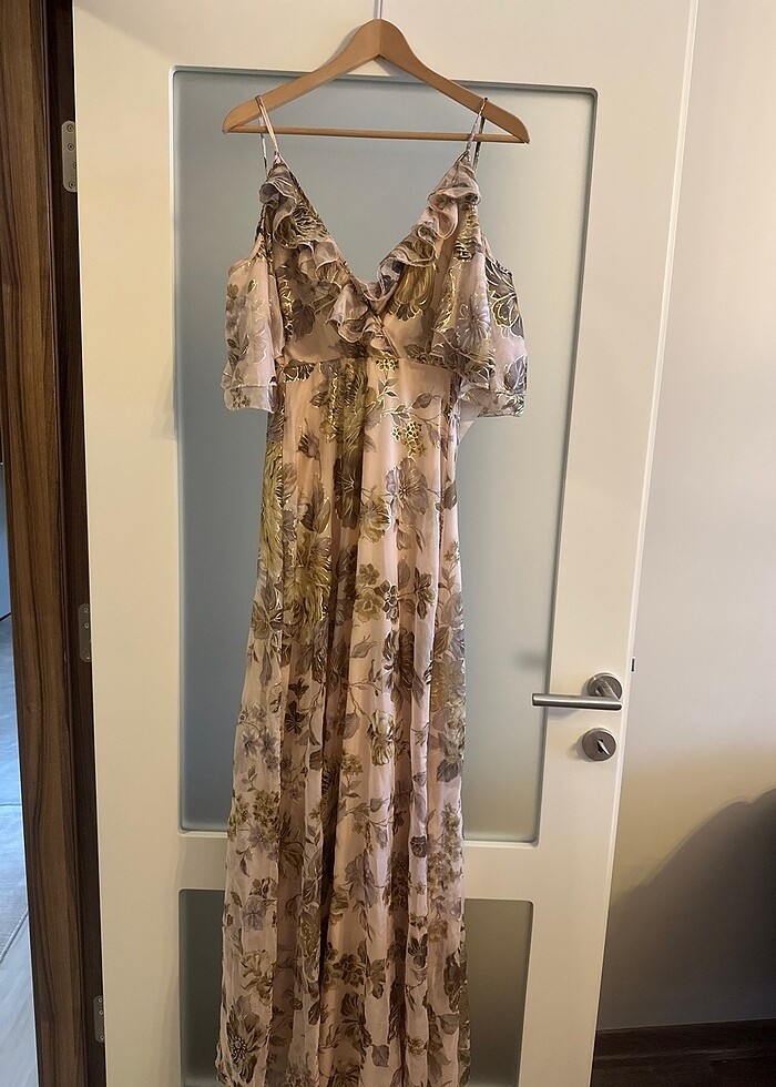 34 beden etiketli, yepyeni elbise, çok şık ve zarif, çiçekleri altın yaldızlı