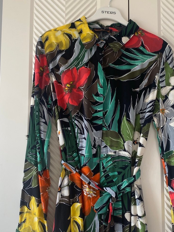 Uzun, bol kesim kadın elbisesi, canlı çiçek desenleriyle, uzun kollu ve yüksek yakalıdır. Düzgün sentetik kumaştan üretilmiş, düğme detaylıdır. Bohem stile uygun.