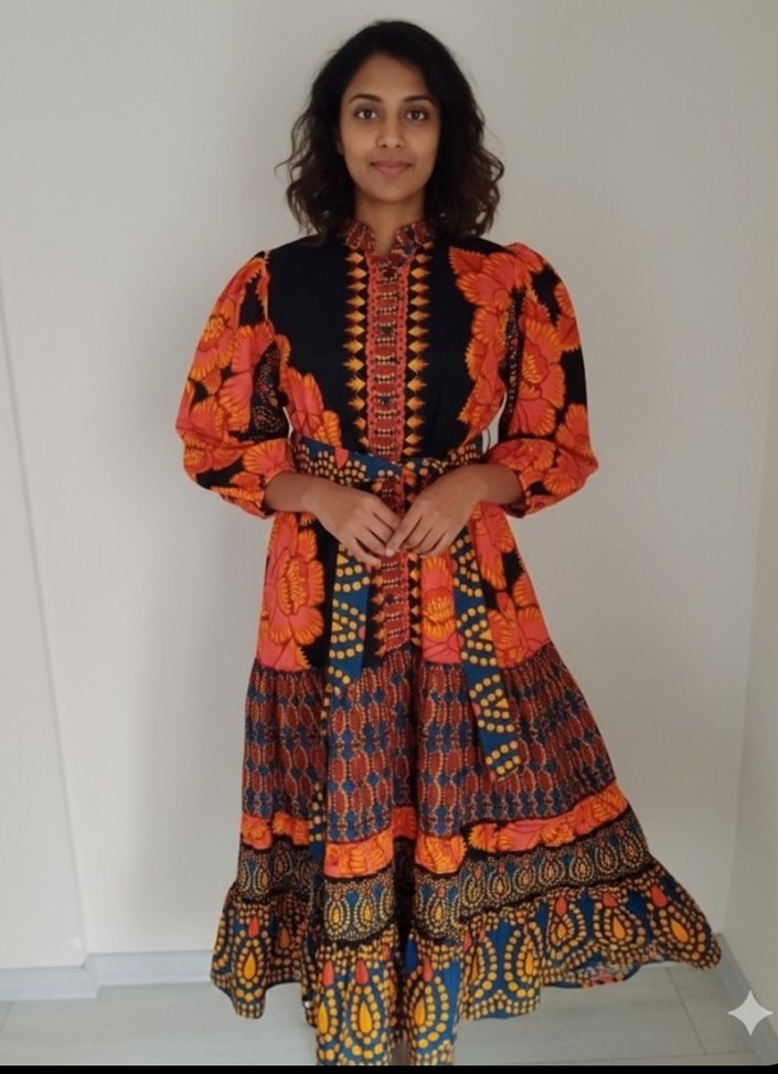Uzun kollu, yüksek yakalı ve kemerli bel detaylı, bol kesim desenli bohem elbise. Koyu tonlarda çok renkli kumaştan yapılmıştır.