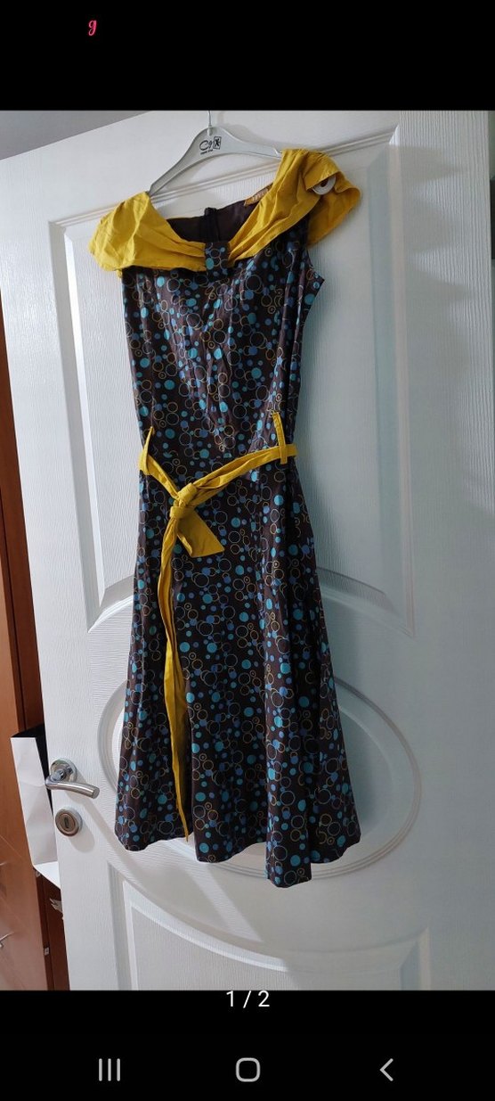 Uzun ve vücuda oturan kadın elbisesi, ince askılı kollara ve koyu renkli çok renkli desenlere sahiptir. Sarı kemer ve yakasıyla bohem vintage tarzındadır.