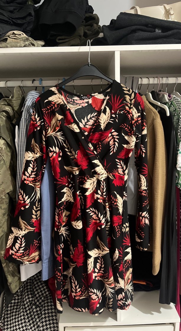 Uzun kollu, v yaka, bol kesim bohem elbise. Drapeli tasarıma sahip, koyu renkli çok desenli sentetik kumaftan, günlük kullanıma uygun.