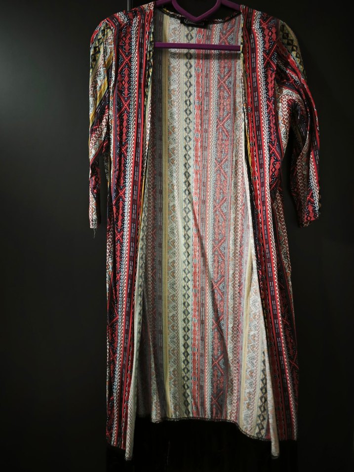 Uzun, bol kesim ve dökümlü tasarıma sahip kadın kimono. Koyu renkli çoklu desenli tekstil kumaştan, uçları püsküllü uzun kollu ve V yakalı. Bohem, hippie ve retro tarzda, günlük kullanıma uygun.