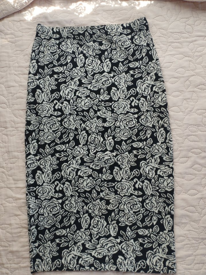 Yumuşak sentetik kumaştan, gri ve beyaz çiçek desenli, volan detaylı uzun kalem etek, bohem stil için uygundur.