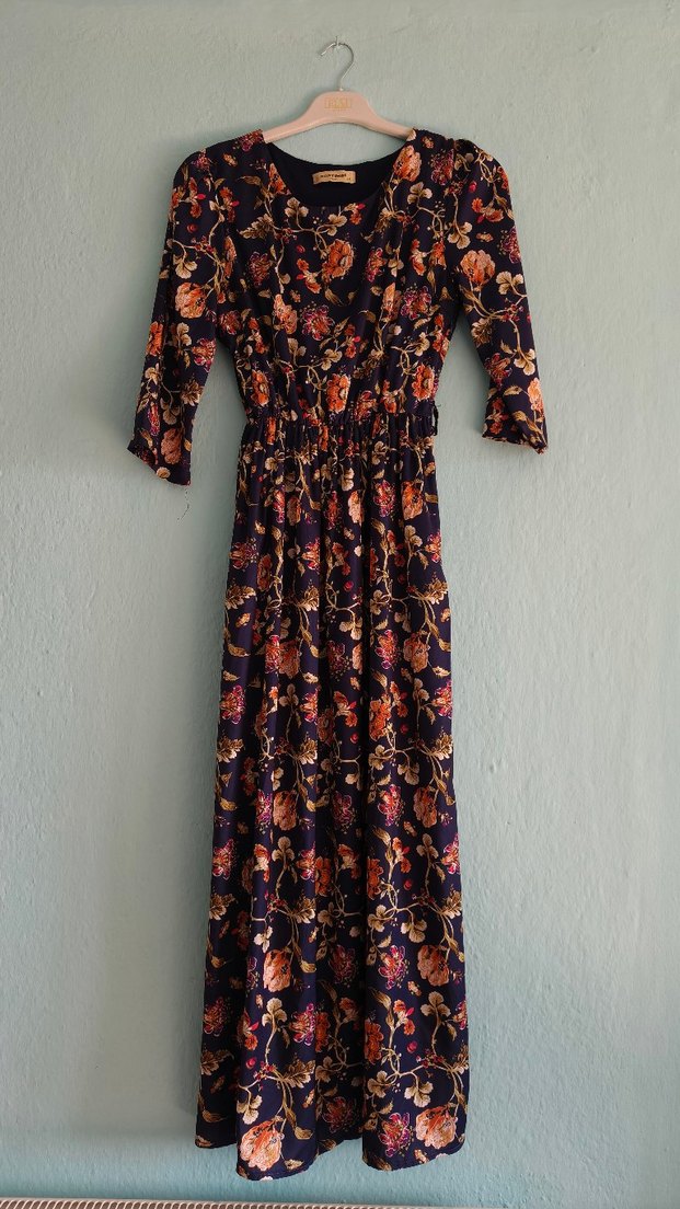 Uzun ve bol kesim bu elbise, koyu mor desenli, V yaka ve ince askılı kollara sahip, yumuşak sentetik kumaştan yapılmıştır. beden 44 yaziyor ama 42 bedene olur
