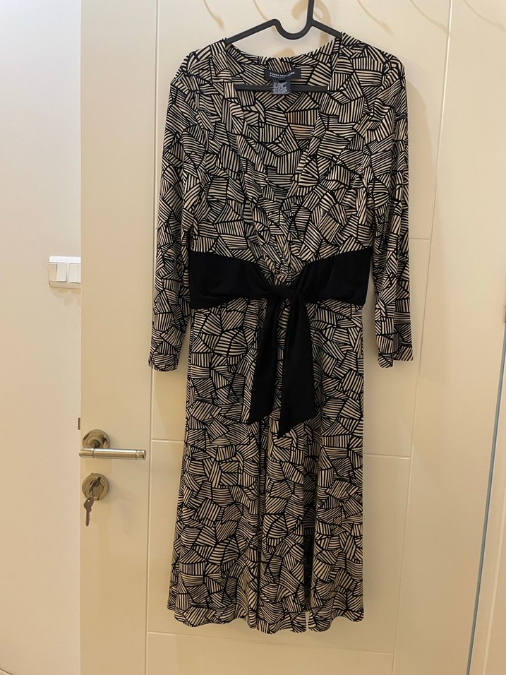 Bu dar kesim hemşirelik sabahlığı uzun boy, V yakalıdır. Desenli ve koyu bej tonlarında, belde siyah bağlama detayı bulunur.