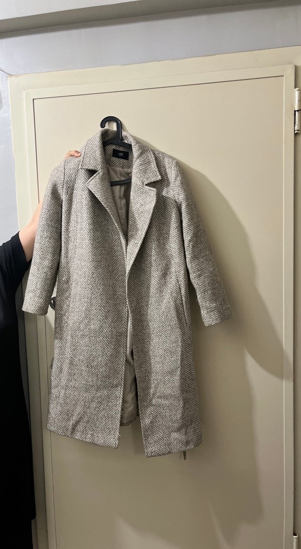Uzun desenli, yaka detaylı ve tam kollu kışlık kaban, dokulu kumaştan üretilmiştir.
