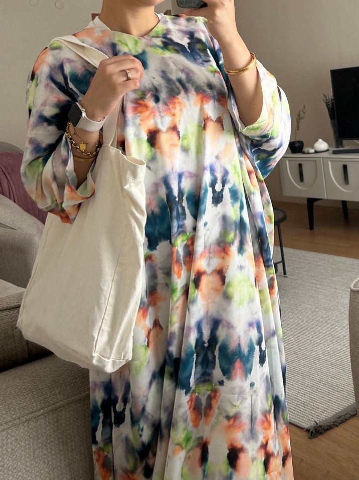 Bir kez giydim tesettür için yakası bi tık kayabiliyor o yüzden tişört giymiştim Yarasa kol uzun elbise ama tam yazlık Touche marka Pastel bağlama desenli, uzun kollu, salaş kesim ve yuvarlak yakalı uzun elbise. Sentetik kumaştan, bohem tarzda günlük sokak giyimine uygun.