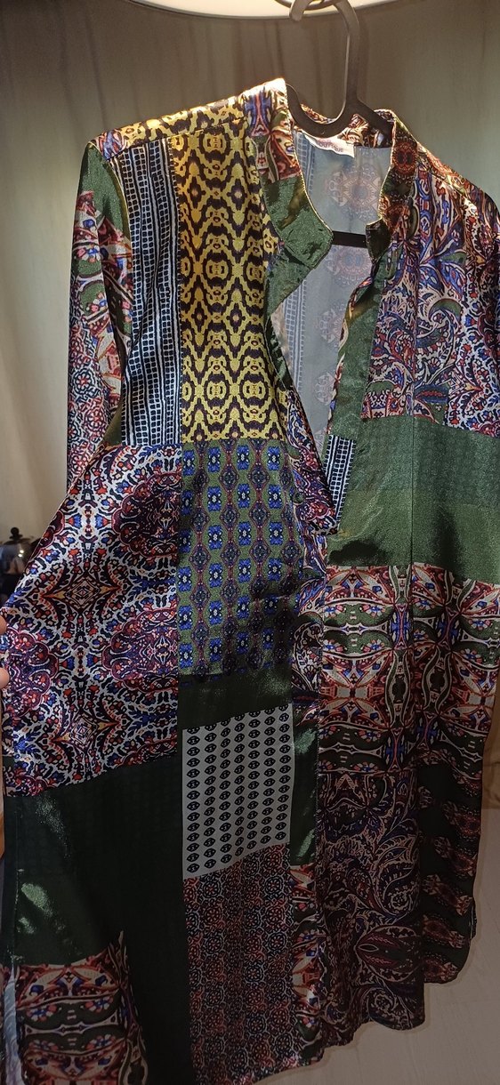 Uzun, salaş kesim kadın kimonosu, yaka detaylı ve uzun kolludur. Canlı koyu renklerde çoklu desenlere sahip, bohem tarz için uygundur.