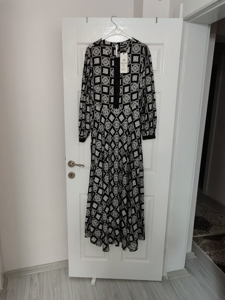 Desenli, uzun kollu, uzun elbise. Sentetik kumaştan, bol kesim, bohem tarzında. hiç giyilmedi