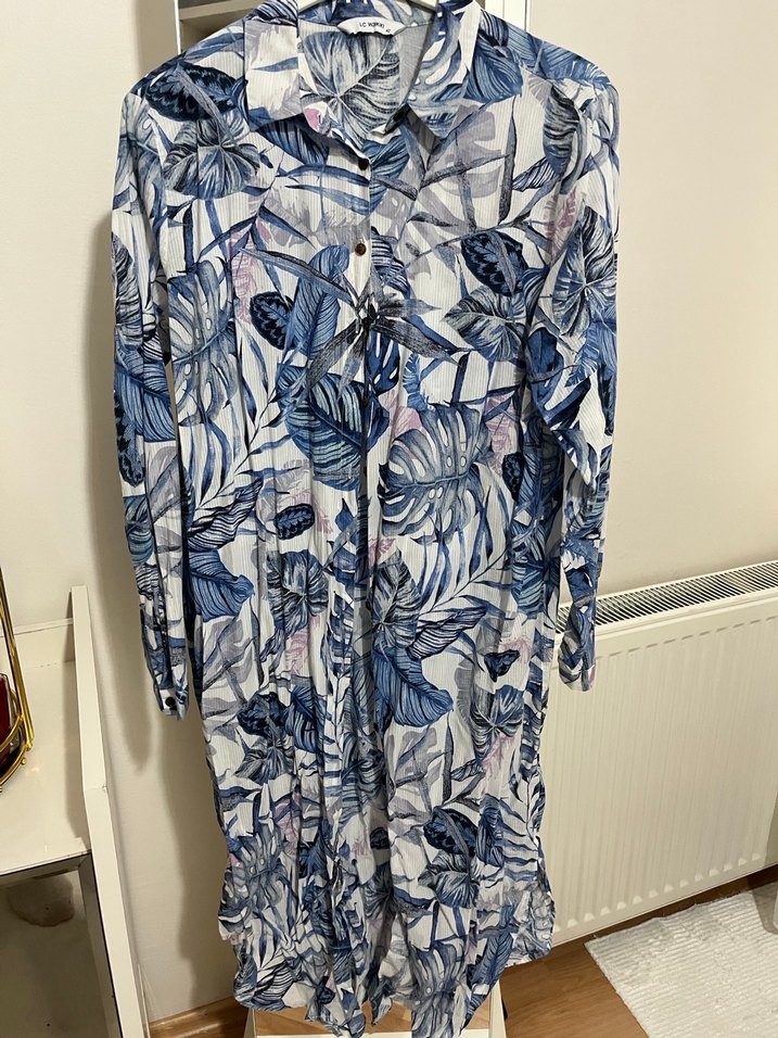 Yumuşak sentetik kumaştan, uzun kollu ve pileli yapıda bohem tarzda, mavi ve gri bağlama desenli