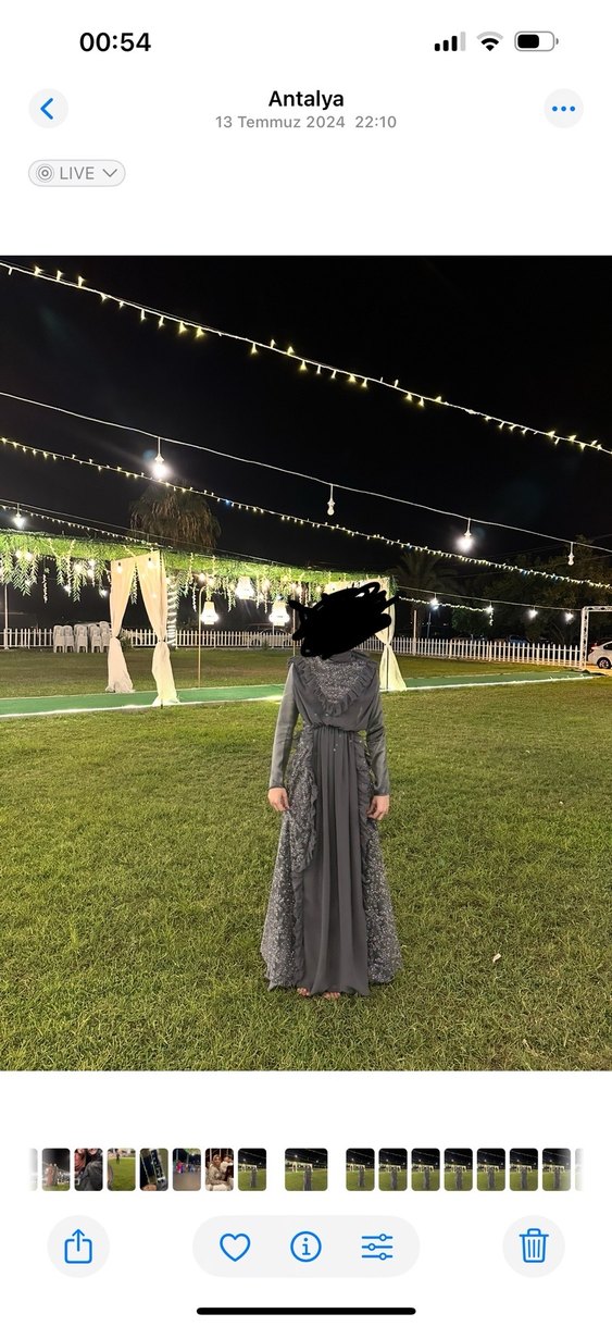 Bu gri uzun abiye elbise, uzun kollu ve yüksek yakalıdır. Drapeli detaylar gotik stil katarken, modest bir görünüm sunar. Düğünler için uygundur. Bir kere kullanıldı. 36-38 bedene uygun. Tasarım