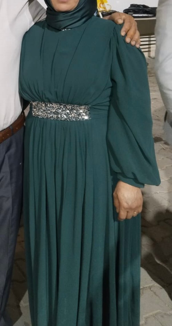 Uzun abiye elbise, bol kesim ve drapeli detaylara sahip. Balon kol, bel kısmında parlak süsleme bulunur. ✨