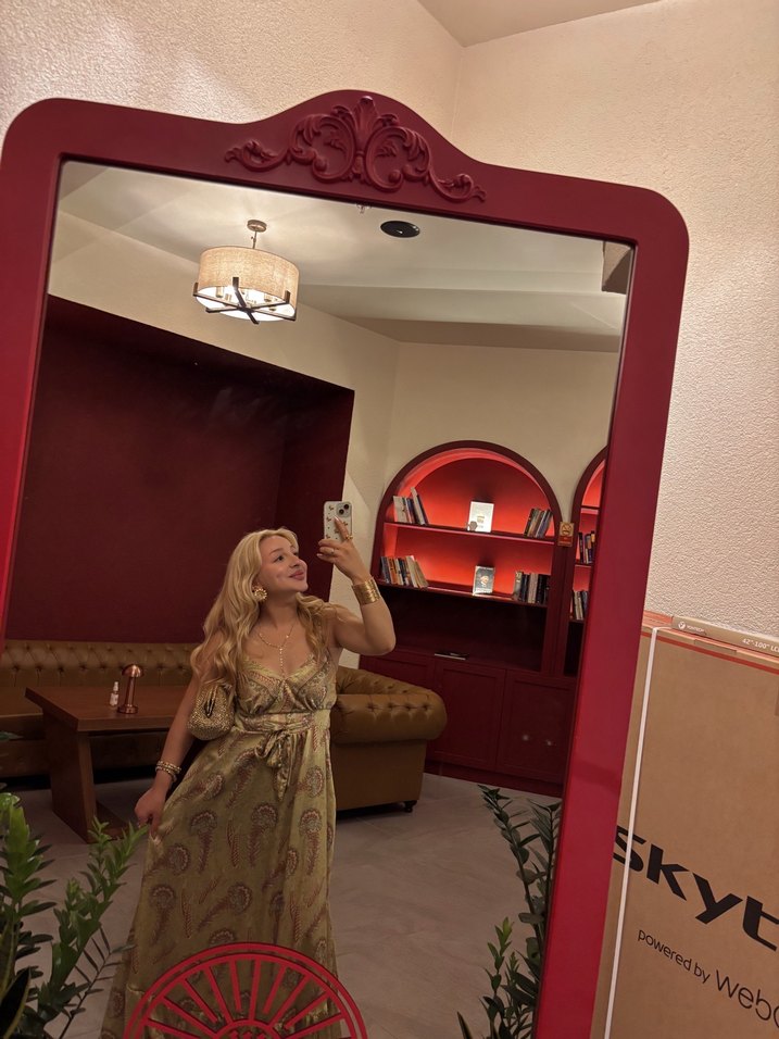Altın renkli, straplez uzun elbise, bol kesim, drapeli ipeksi kumaş ve etnik desenlerle bohem tarzı partiler için uygundur. ✨