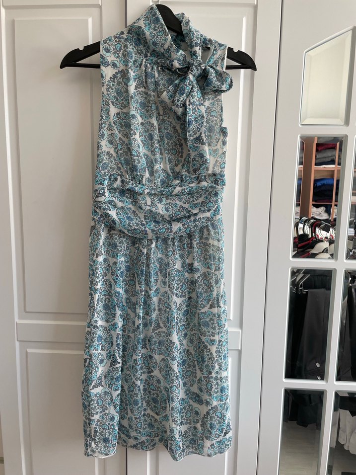 Turkuaz ve gri tonlarında batik desenli, yumuşak dokulu, uzun ve drapeli, halter yakalı kolsuz elbise. Ofis kullanımı için uygun. İçi astarlı hakim yaka boyun yanından bağlamalı kadın şifon elbise. Kolsuzdur. Kol oyuntusu çok açık değildir.el bölgesi lastikli ve drapelidir.şık bir elbisedir. Boy 100 cm bel 70 cm lastikli dir. Yandan fermuarlıdır. Bütün giyim ürünleri toplu satışa açıktır